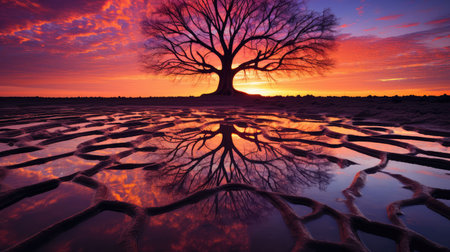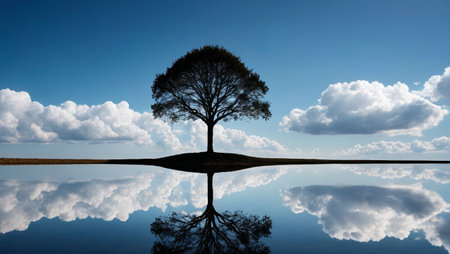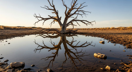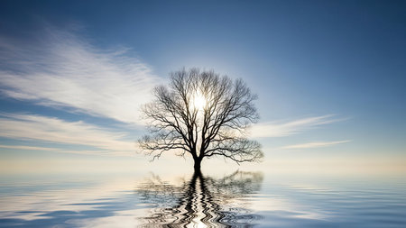 A lone, bare tree stands silhouetted against a bright sky, its reflection shimmering on the still water below.