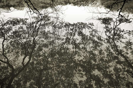 Reflections of tree branches on water at Hoan Kiem Lake, Hanoi, Vietnam.