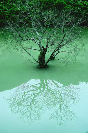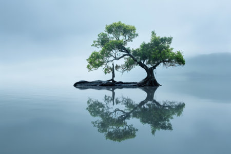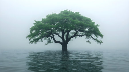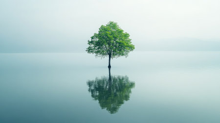 Green tree emerges from still water in a foggy environment, creating a peaceful scene with reflections visible on the water's surface