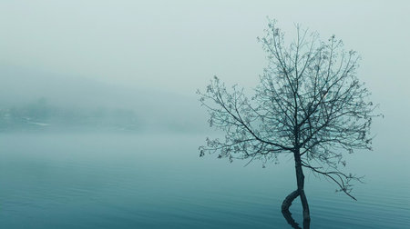 This atmospheric image captures the poignant beauty of a solitary tree standing resilient in calm waters, enveloped by the soft embrace of mist. The delicate branches, bereft of leaves, tell a story of endurance and adaptability. The subtle gradation of blues and grays in the background brings a sense of peace and depth to the image, as the tree's reflection ripples gently across the water's surface. This minimalist scene is perfect for conveying themes of tranquility, the elegance of nature's simplicity, and the reflective quality of solitude. Ideal for use in wellness and meditation spaces, or as a contemplative background for creative projects.