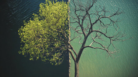 This captivating image showcases the stark contrast between a thriving tree and its barren counterpart, symbolizing life and death beside serene waters.