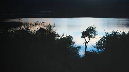 Lone spiny tree silhouetted against the twilight sky reflections over lake Potrero de los Funes, in San Luis, Argentina.