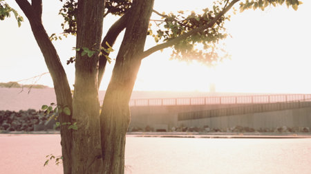 A serene scene unfolds as gentle sunlight shines through the leaves of a tree, casting a warm glow. The tranquil riverbank invites relaxation as nature awakens at dusk.