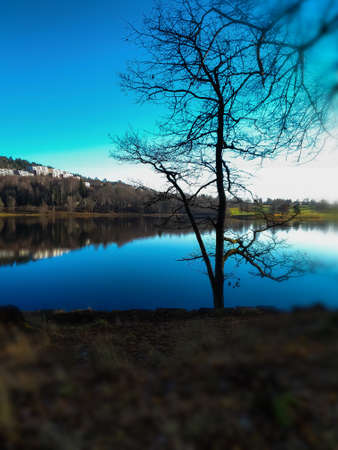 A beautiful scenery of a water surface with the reflection of bare tree branches