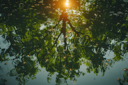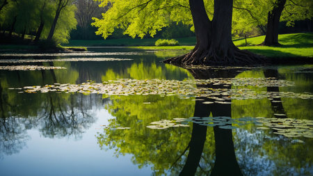 The reflection of springtime trees shimmers in a crysta. Concept l-clear pond, creating a serene and breathtaking natural landscape,