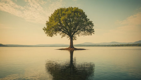 A majestic lone tree with green foliage standing in calm waters against a serene landscape