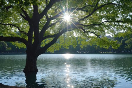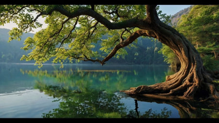 A stunning tree with lush leaves stands beside a tranquil water surface, reflecting its beauty. This serene nature scene captures peacefulness and harmony.