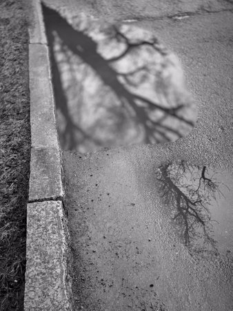 Puddle of water on asphalt and old road reflecting a deciduous tree in winter