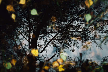 Reflection of a tree in a puddle in the forest top view. Natural background. Autumn leaves on the water surface close-up. Abstract background