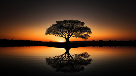 A striking image of a golden tree silhouetted against a dark background, reflected in calm water, evoking tranquility.