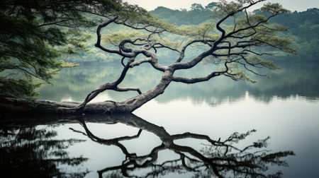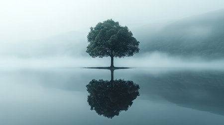 A stunning scene capturing a solitary tree standing by a calm lake, its reflection beautifully mirrored in the water beneath a gentle morning fog, evoking serenity and stillness.