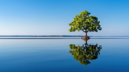 Lonely green tree in shallow calm waters, clear reflection visible, isolated on serene lake background