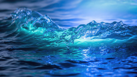 This stunning close-up photography showcases a vibrant blue ocean wave illuminated by soft light reflections during sunset, capturing the dynamic beauty of nature.