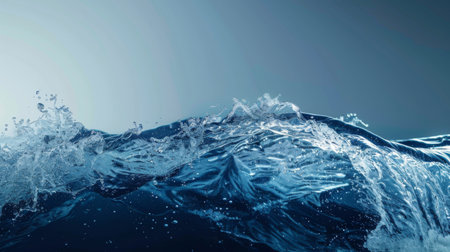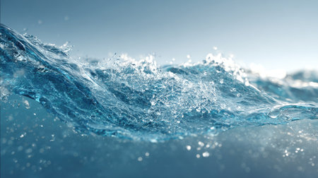 A stunning image of a clear water wave captured in motion, showcasing brilliant splashes against a soft blue background, perfect for themes of nature and refreshment.