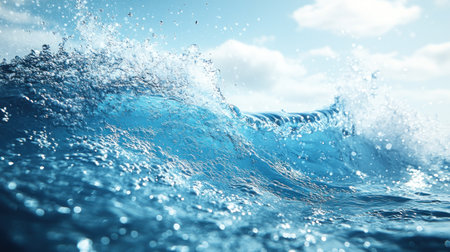 A vibrant, close-up shot of a wave cresting, showcasing the power and beauty of the ocean. Splashes of water are frozen in time against a soft blue sky.