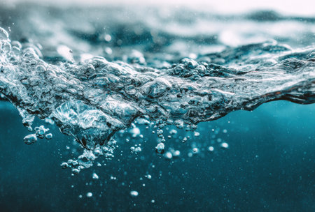 Macro shot of bubbling water with light reflections, capturing the dynamic movement and sparkling details.