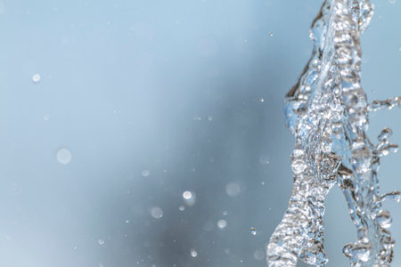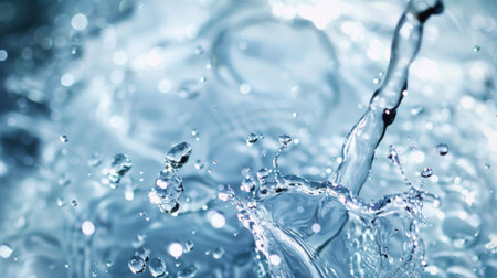 Close-up of splashing water droplets in motion, capturing the dynamic and refreshing essence of water in blue hues. High quality photo