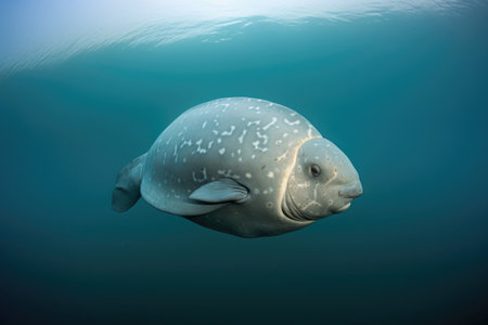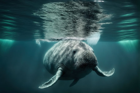 A large sea cow gracefully swims through clear blue water showing its unique features and exquisite textures in a serene underwater environment.