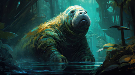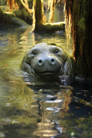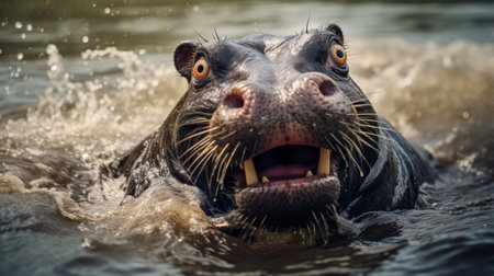 a contest-winning photograph captures a taxidermy hippo in the mysterious jungle. the bold and expressive portrait showcases dynamic facial expressions, exaggerated by the fish-eye lens. the strong facial expression of the hippo splashing around in the water adds to the overall dramatic effect of the image. ai generated