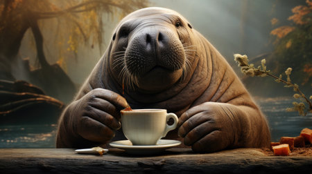 Walrus with a cup of coffee on a wooden table in the forest