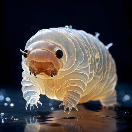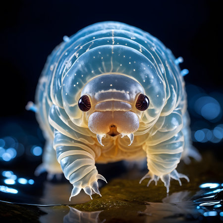 Close-up of a tardigrade walking on moss fibers, its glowing body showcasing its resilience in extreme environments