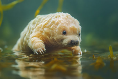 A fluffy sea creature is exploring a lush underwater environment filled with vibrant green seaweed during daylight hours.