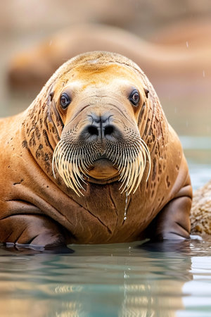 Walrus resting in water, observing directly with its prominent whiskers