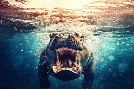 A captivating image of a hippo opening its mouth underwater in a serene pond, showcasing its powerful jaws and vibrant aquatic environment.