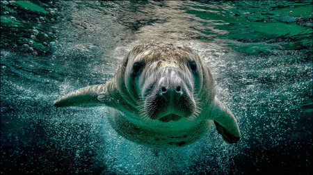 A captivating image of a gentle manatee swimming gracefully underwater, surrounded by bubbles and illuminated by natural light, showcasing the beauty of marine life.
