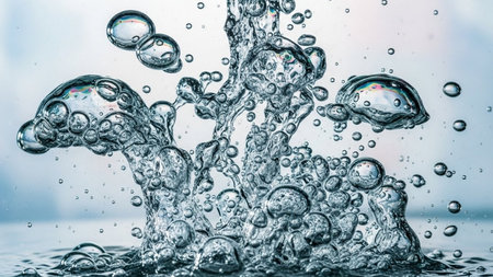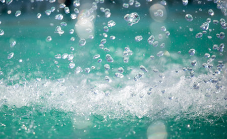Close-up of dynamic water splashing, creating an array of bubbles and droplets in a vibrant, energetic scene.
