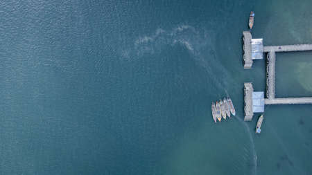 Aerial view photo of small motor boat or yacht standing near the wooden pier