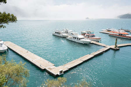 Landscape of famous attraction, Sun Moon Lake at Taiwan, with boats on dock at sunny day.