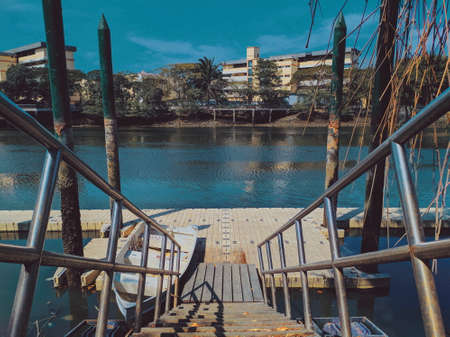 Floating fishing pontoon at a boat ramp on the river close to the city, cloudy day
