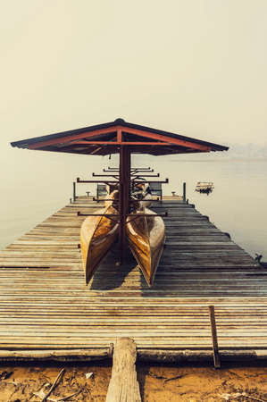 A small dock in a misty morning at Samprasob River,Sangkhlaburi,Thailand with vintage filter