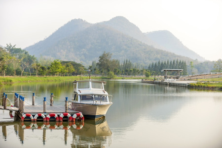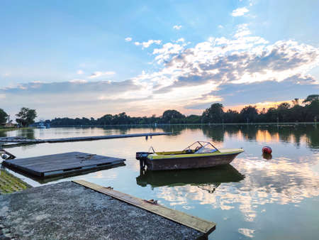 beautiful morning on the lake. The boat next to a pontoon on the water. Summer time