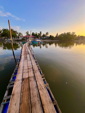 aged wooden bridge on the river for fishing, quiet water, rest