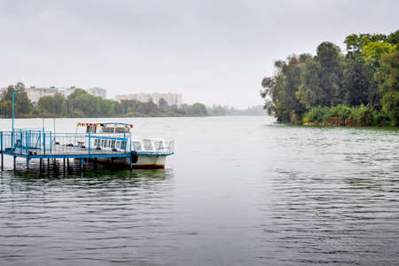 Boat for walks on the pier. Lake in the city park