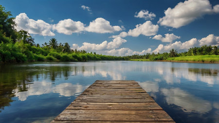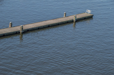 Wooden pier without people on tranquil lake or river. Summertime landscape photography