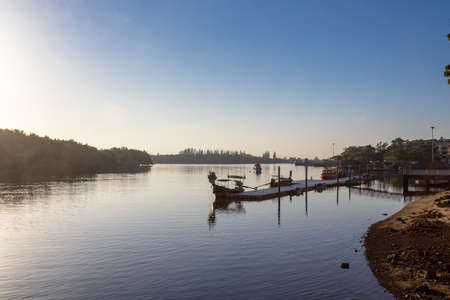 KRABI, THAILAND - JANUARY 23, 2020 - Beautiful natural view of boats, pier, mangrove forest at Krabi River, Krabi, Thailand.