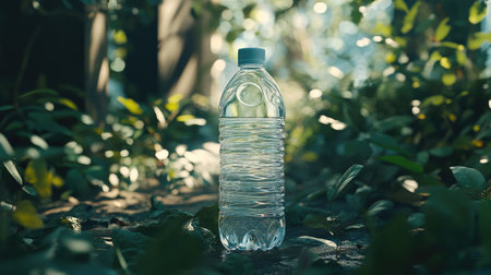 A clear plastic bottle of water stands tall among vibrant green leaves, illuminated by soft sunlight, symbolizing hydration and connection to nature's beauty.