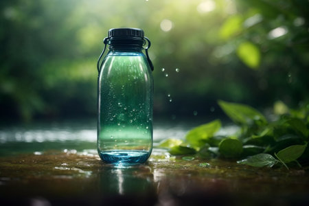 A transparent glass bottle containing pure water is placed in rippling water, creating reflections and a refreshing feel.