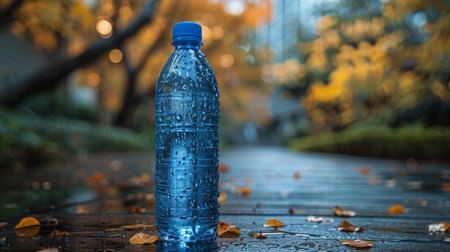 A plastic water bottle sits on a wet path surrounded by fallen autumn leaves, evoking freshness and nature. Perfect for themes of hydration, environment, and outdoor activities.