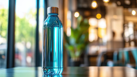 A clear water bottle rests on a table, reflecting ambient light in a contemporary cafe. The bright background enhances the water's refreshing appeal.