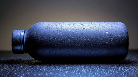 A sleek matte black water bottle lies on a dark surface, adorned with glistening water droplets. The studio lighting enhances its modern appeal and texture.