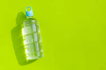 Plastic water bottle with yellow cap on the blue background. Minimalist photo of water bottle with copy space.