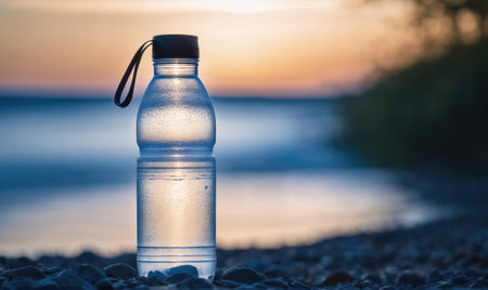 A captivating image captures a hand pouring fresh water from a plastic bottle into a serene outdoor water source during sunset, showcasing nature's beauty.