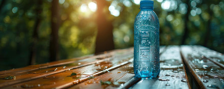 Close up shot of plastic bottle with white cap filled with water on the brown outdoor camping table with green nature - trees, grass and background. Importance of hydration and drinking water