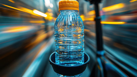 Plastic water bottle in a bicycle cup holder, blurred motion background suggesting movement