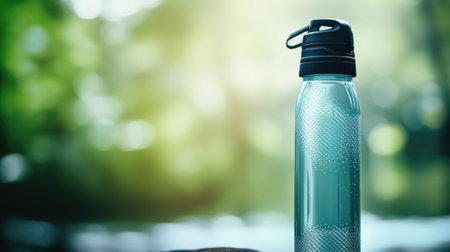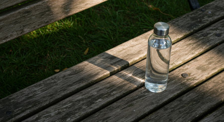 Detox program with a refreshing bottle of drinking water on a park bench after a workout or a fitness run.
