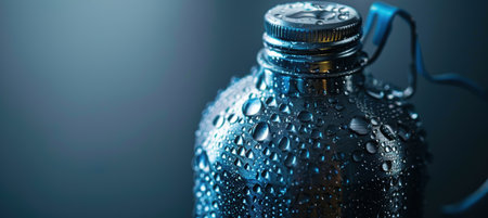 This image features a clear water bottle adorned with shimmering droplets, set against a dark background illuminated by soft blue bokeh lights, symbolizing purity and refreshment.